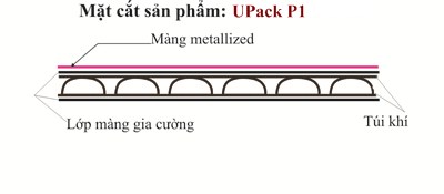 Màng xốp hơi ghép bạc hai mặt UPack P1 là vật liệu được cấu tạo bởi một lớp nhựa PE gồm nhiều túi khí tròn ø=10mm, một mặt phủ màng MPET (màng xi mạ nhôm). Lớp màng MPET màu sáng bạc giúp phản xạ nhiệt bức xạ. Lớp nhựa túi khí giúp tản nhiệt nhanh và ngăn sóng âm thanh truyền qua.