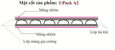 vật liệu Cách Nhiệt UPack A2 (hai Mặt Nhôm) được tạo bởi hai lớp màng nhôm phủ lên 2 mặt ngoài của lớp nhựa polyethylene chứa túi khí. Sản phẩm đóng gói dạng cuộn có quy cách Rộng 1.55m x Dài 40m = 62m2 ( với những đơn hàng đặc biệt có thể đặt với chiều dài tùy ý).